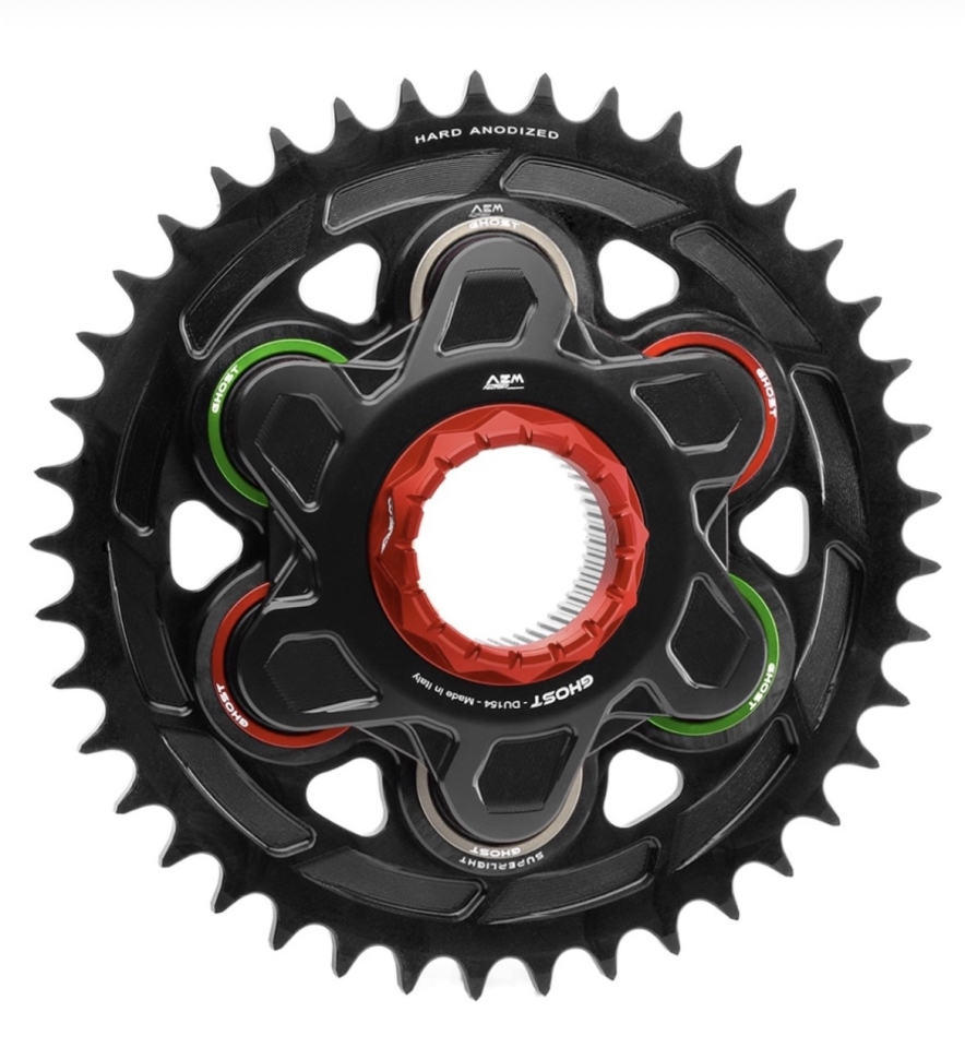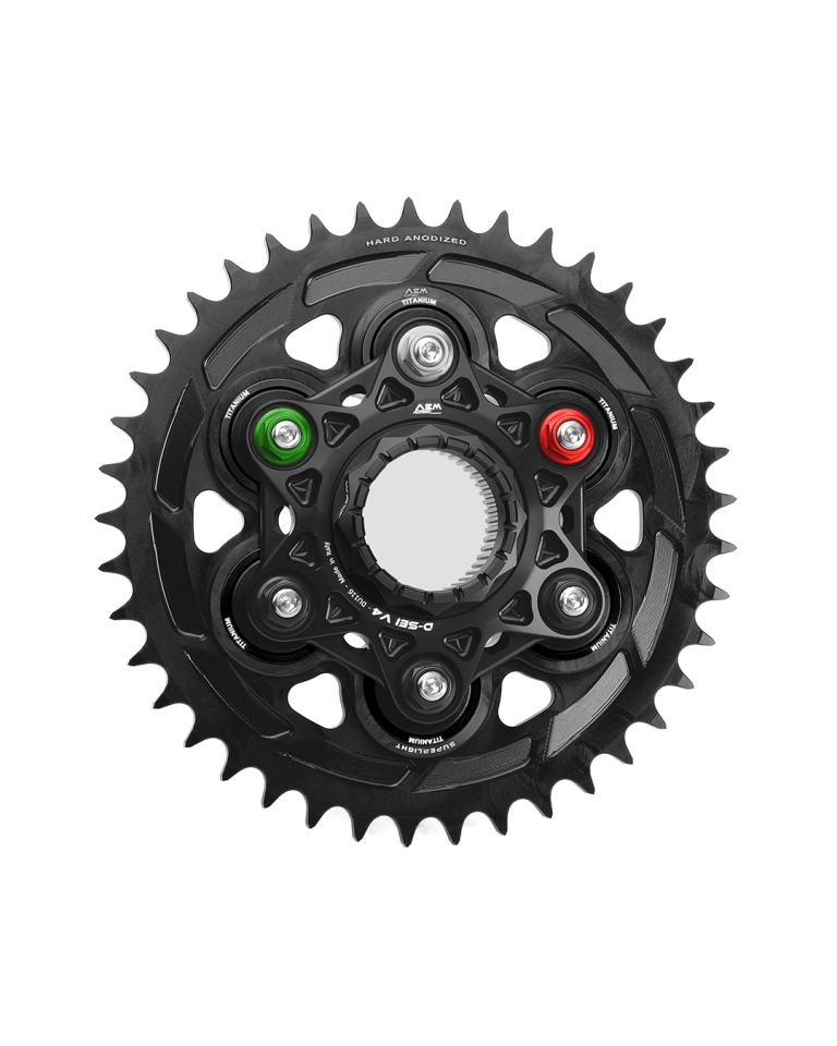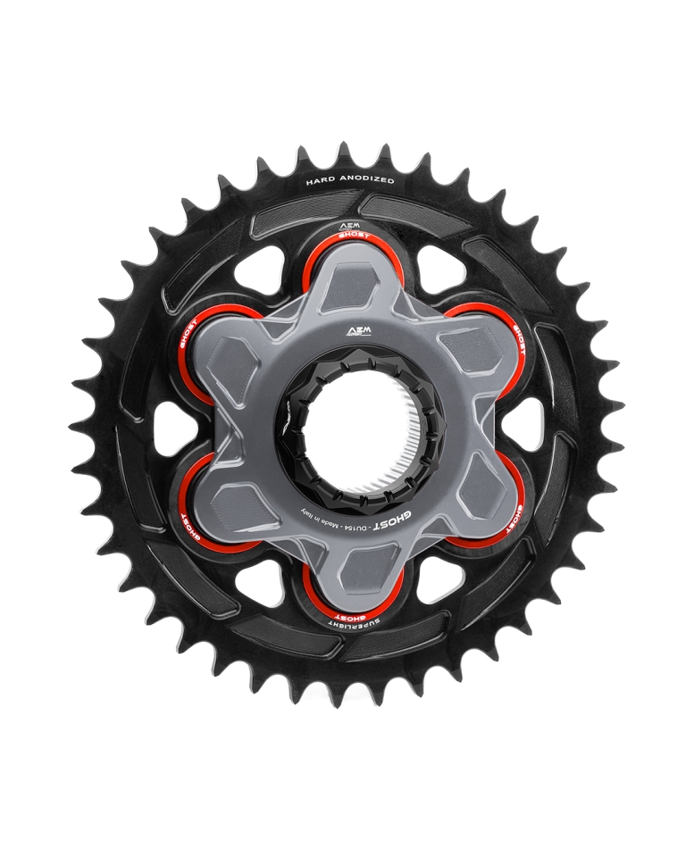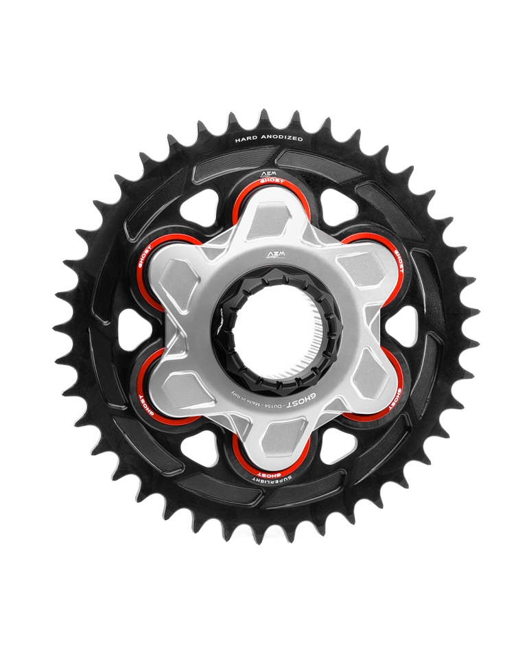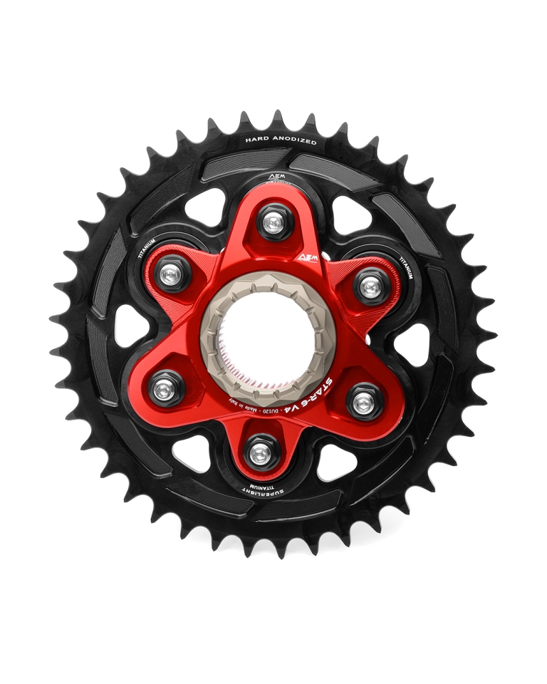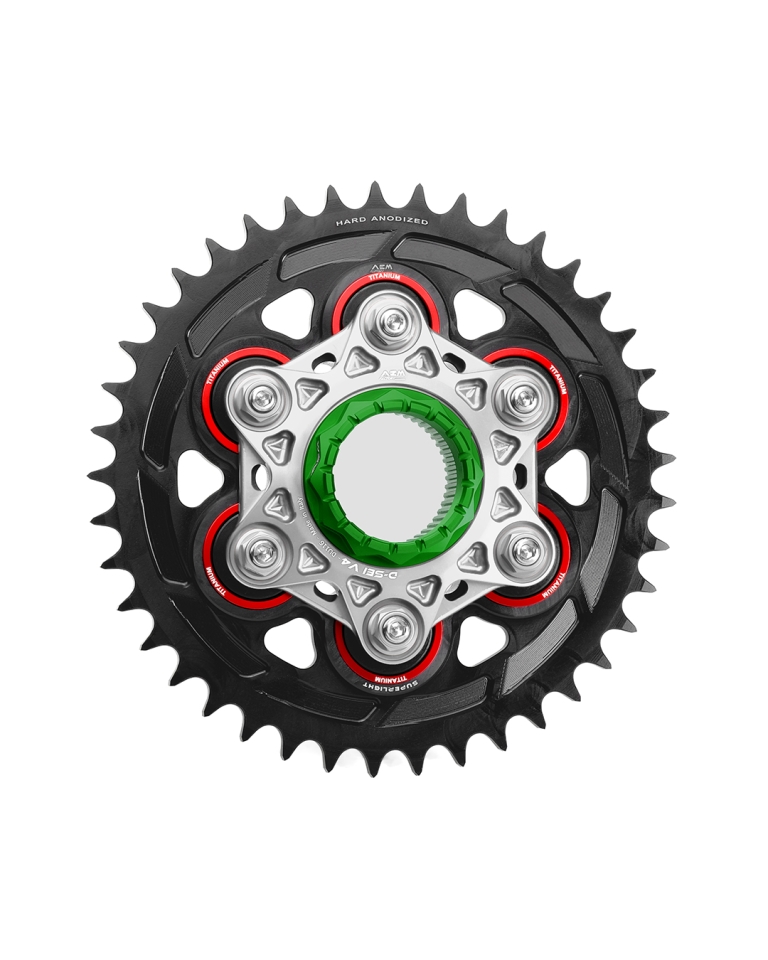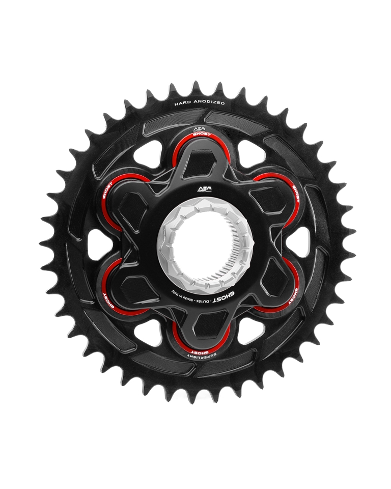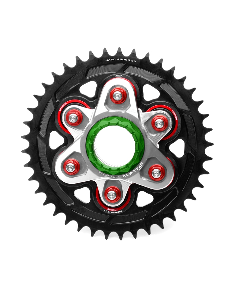 Superleichtes Kettenrad in Aluminium CNC-gefräst und schwarz hardcoat-beschichtet. Lieferbar in den Grössen 520 oder 525 und mit 41, 42 oder 43 Zähnen. Passend für alle Ducati Modelle mit Monoschwinge und grosser Achse. Gewicht Kettenrad nur 535 Gramm. Gewicht komplett mit Ghoost-Flansch 1.15 kg, mit Star-6 1.24 kg.